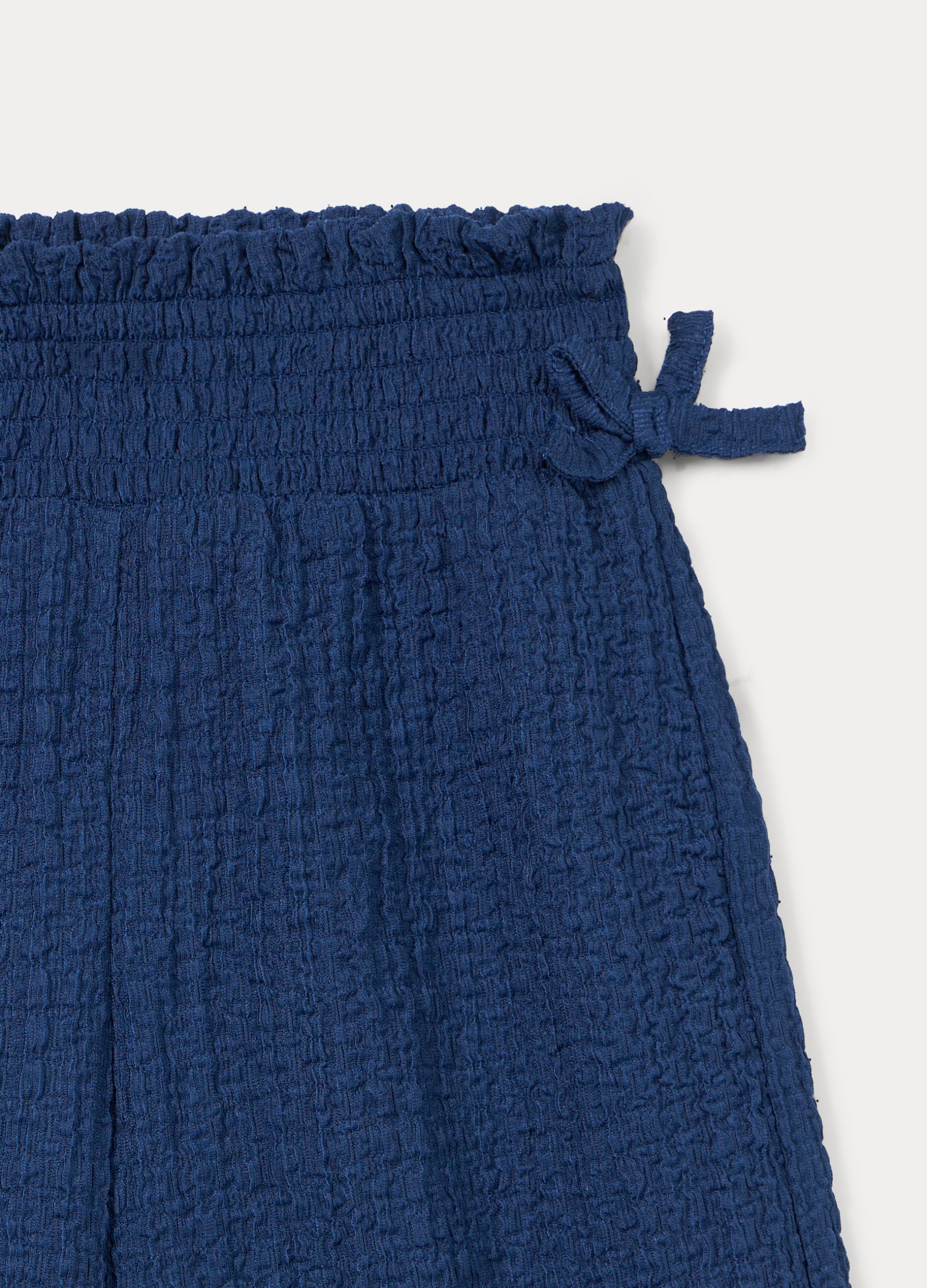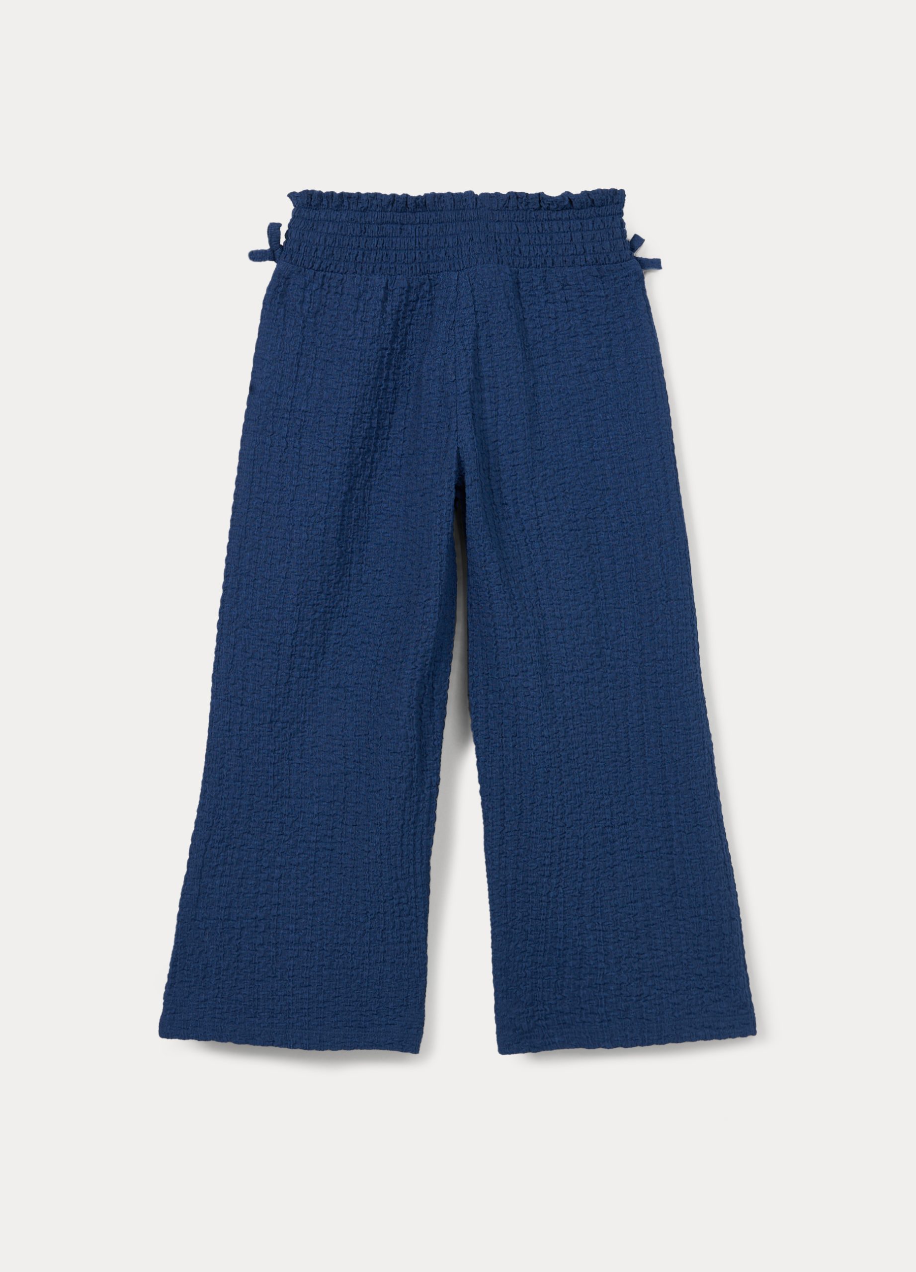 Hlače širokih nogavica s elastičnim strukom i dva našivena ukrasna elementa. Jednobojne.