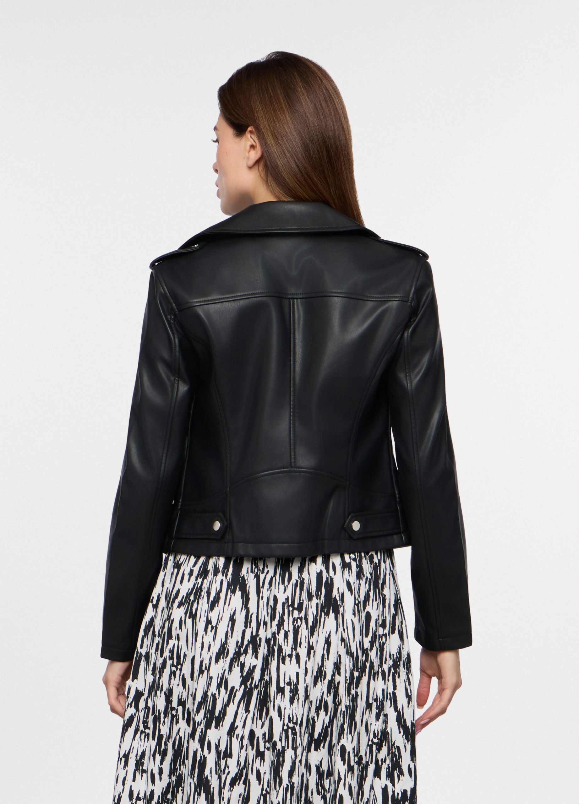 Jakna od umjetne kože, dvoredno kopčanje s preklopnim ovratnikom. Kopčanje cijelom duljinom patentnim zatvaračem. Dva džepa s obrubom na prednjoj strani s patentnim zatvaračem. Jednobojna.