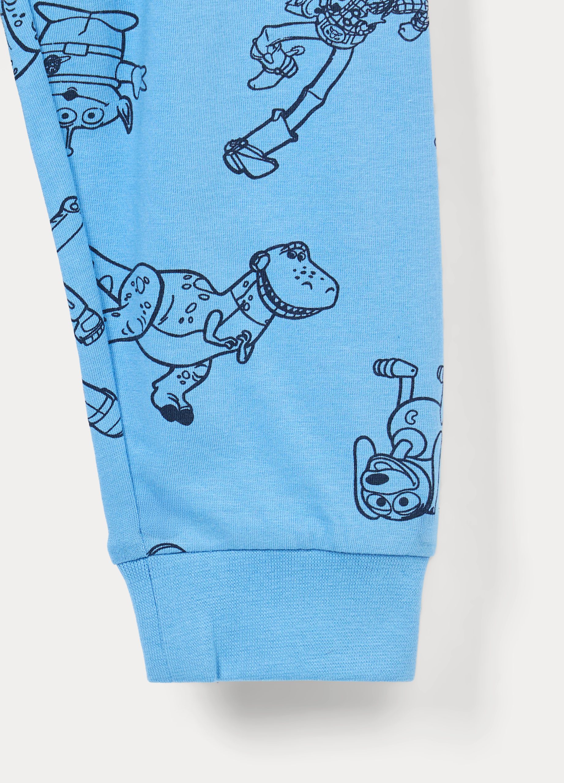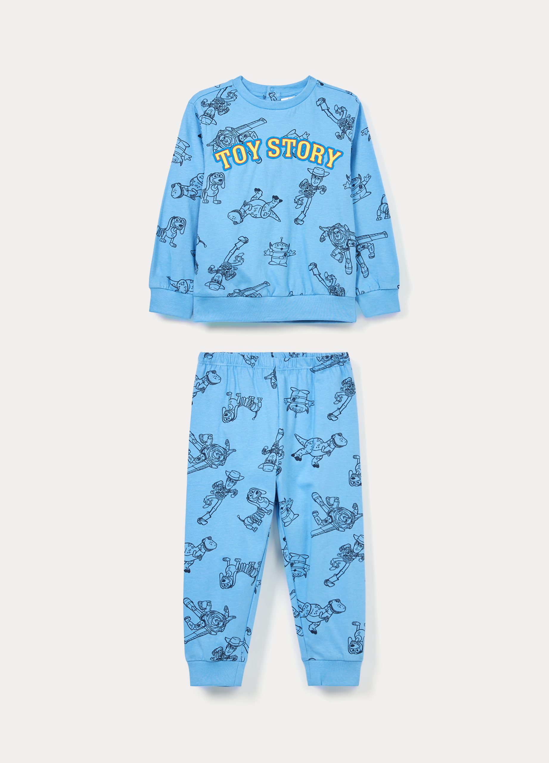 Komplet pidžame Toy Story od čistog pamučnog dresa s cjelokupnim uzorkom koji se sastoji od topa okruglog izreza s kopčanjem na gumbe straga. Okrugli izrez, donji dio i manšete od rebraste tkanine. Hlače s elastičnim strukom.