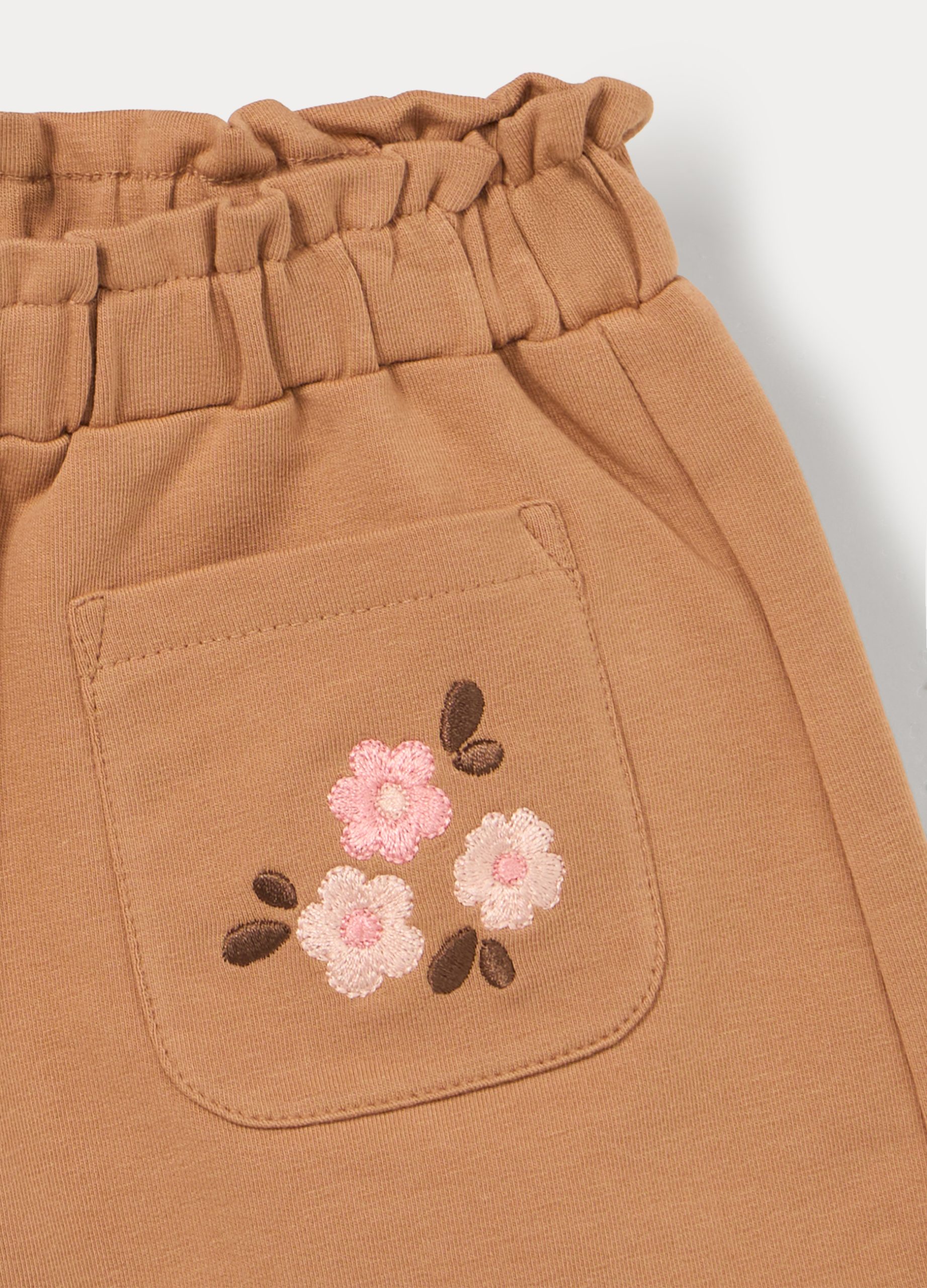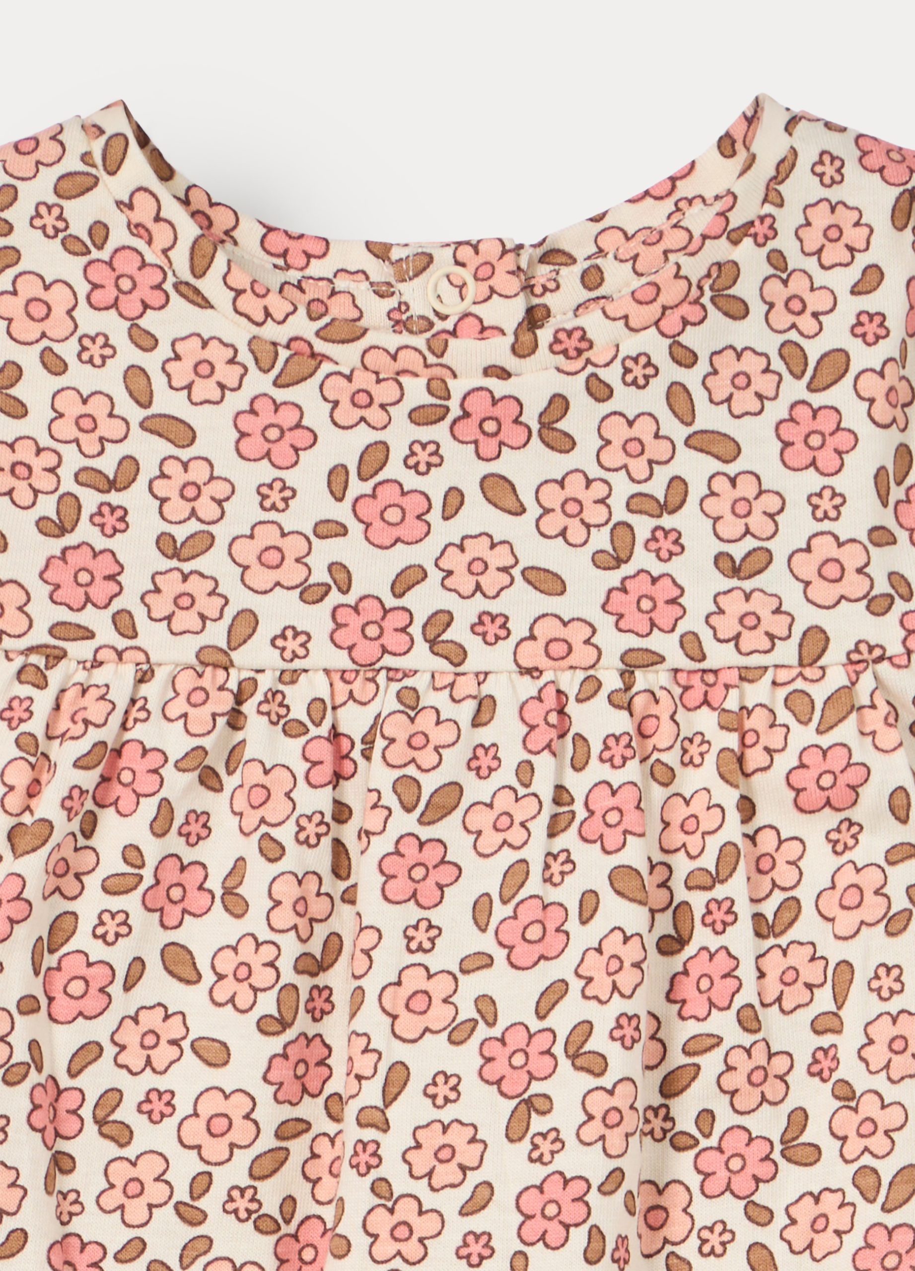 Komplet za trčanje od jerseyja čistog pamuka koji se sastoji od majice okruglog izreza s cvjetnim printom po cijeloj površini. Kratki rukavi s našivenim volanima. Kopčanje gumbom na leđima. Kratke hlače s paperbag elastičnim strukom i dva džepa sprijeda s vezom.