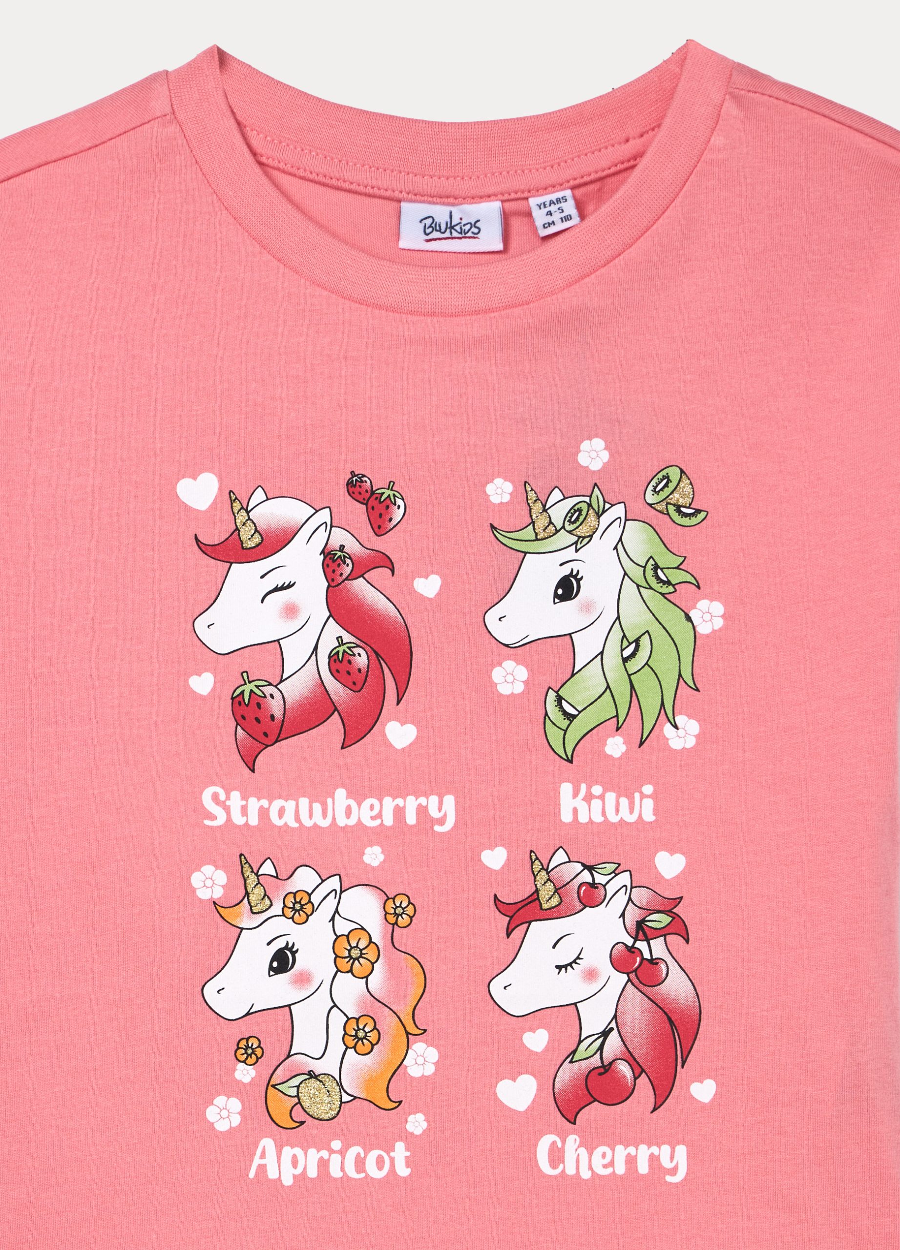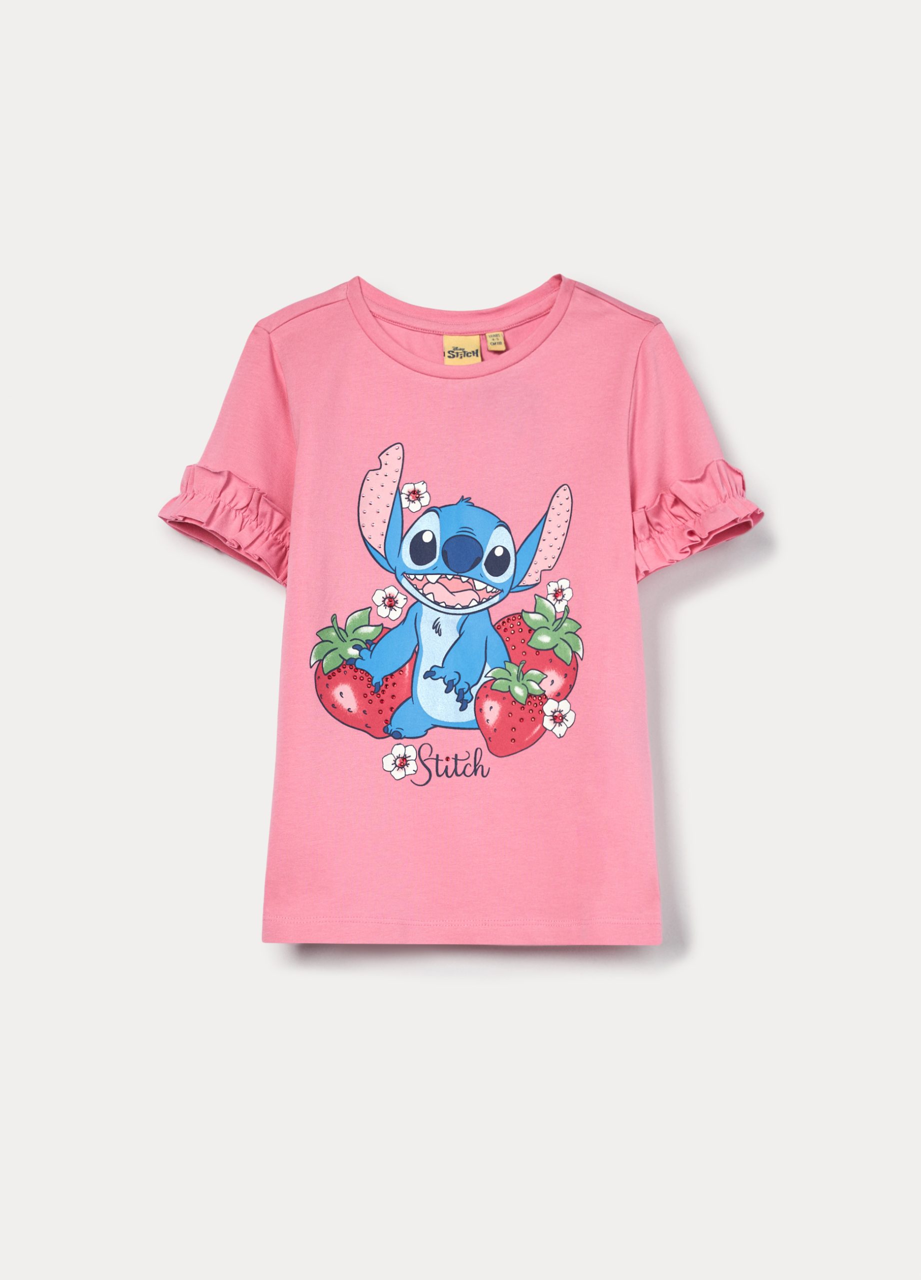 Majica od jerseya od čistog pamuka s rebrastim okruglim izrezom i kratkim rukavima. Svjetlucavi print na prednjoj strani.