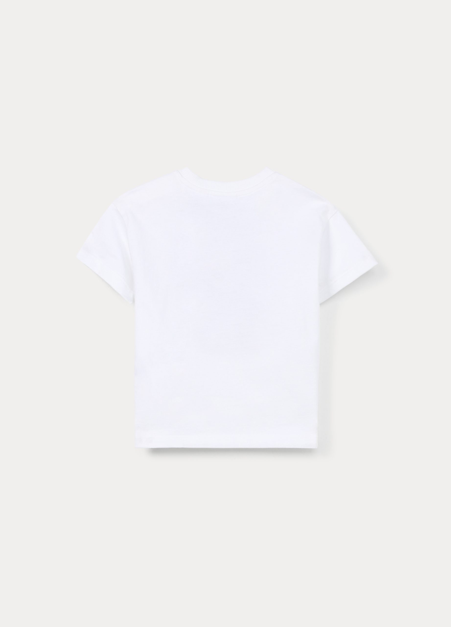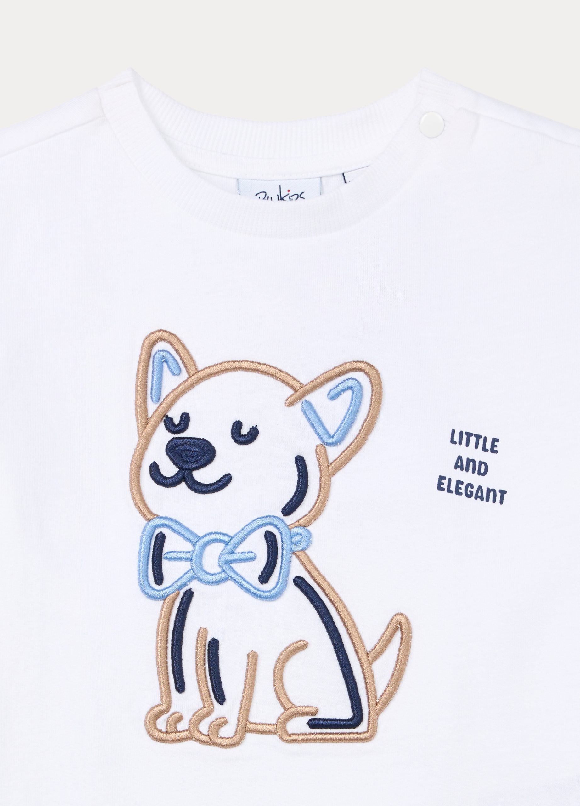 Majica od rastezljivog pamučnog jerseya s rebrastim okruglim izrezom i vezom. Kratki rukavi i kopčanje gumbom na ramenu.
