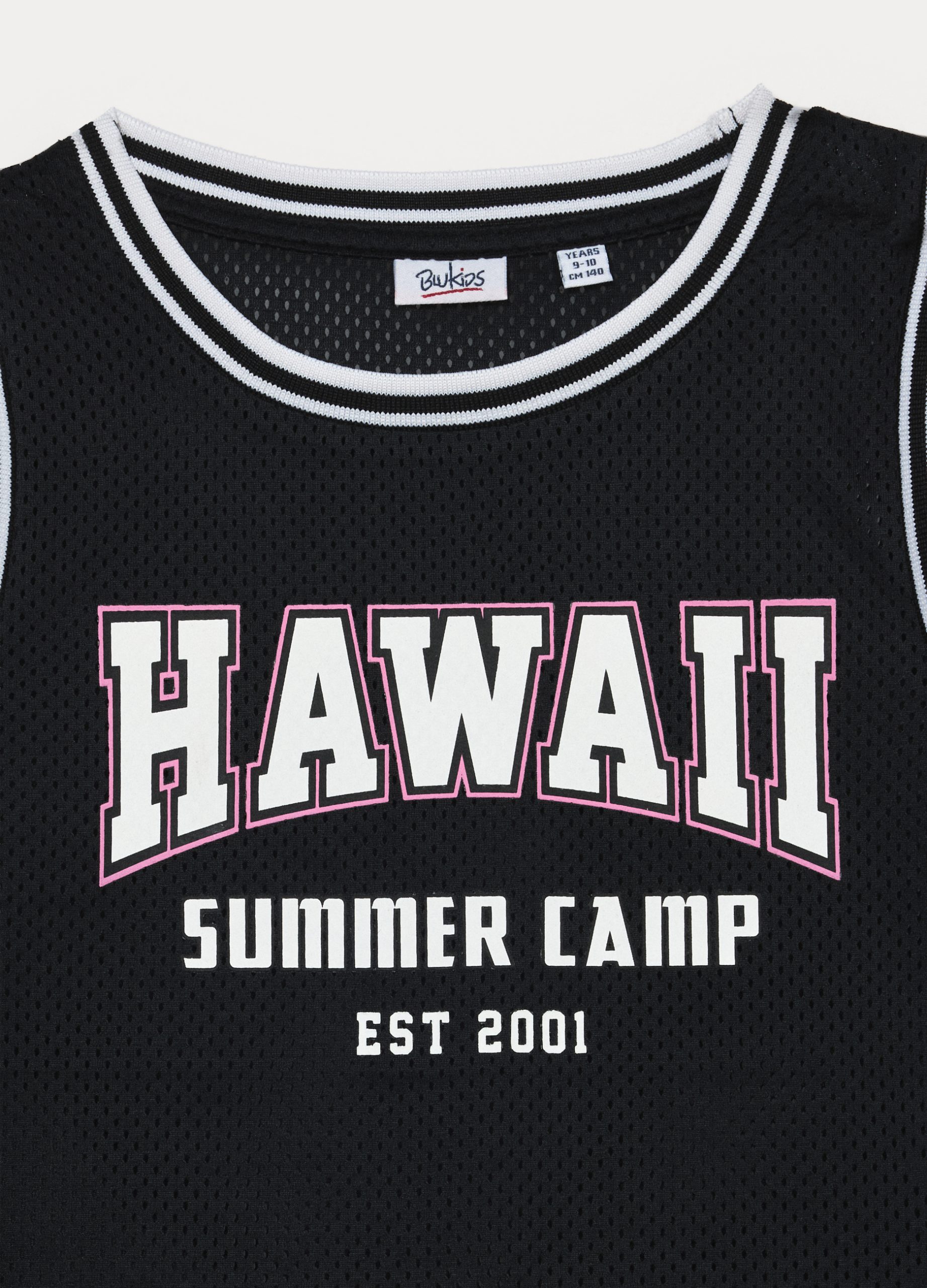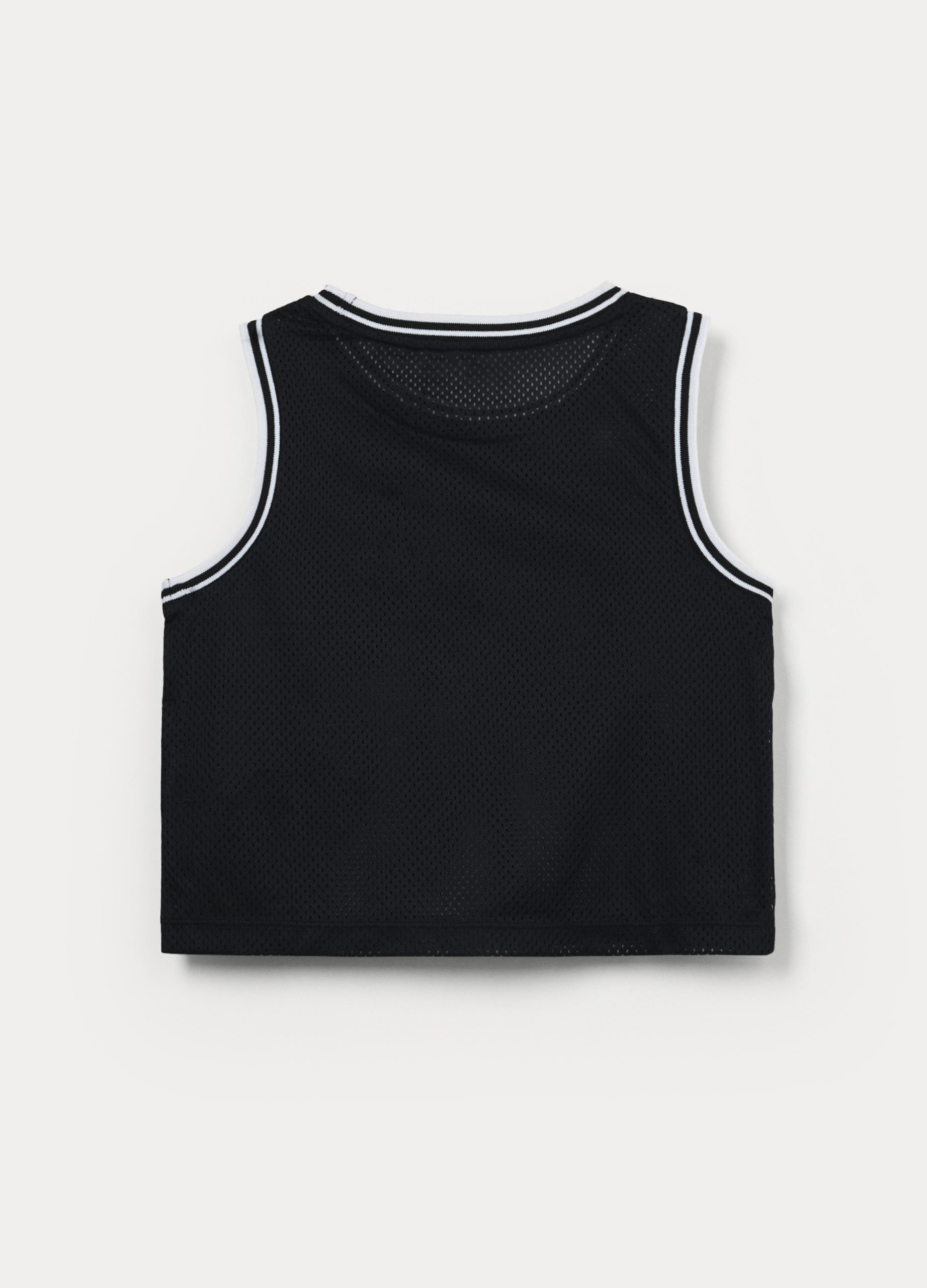 Mrežasta majica s printom. Okrugli izrez i obrub oko rukava s rebrastim prugastim uzorkom.