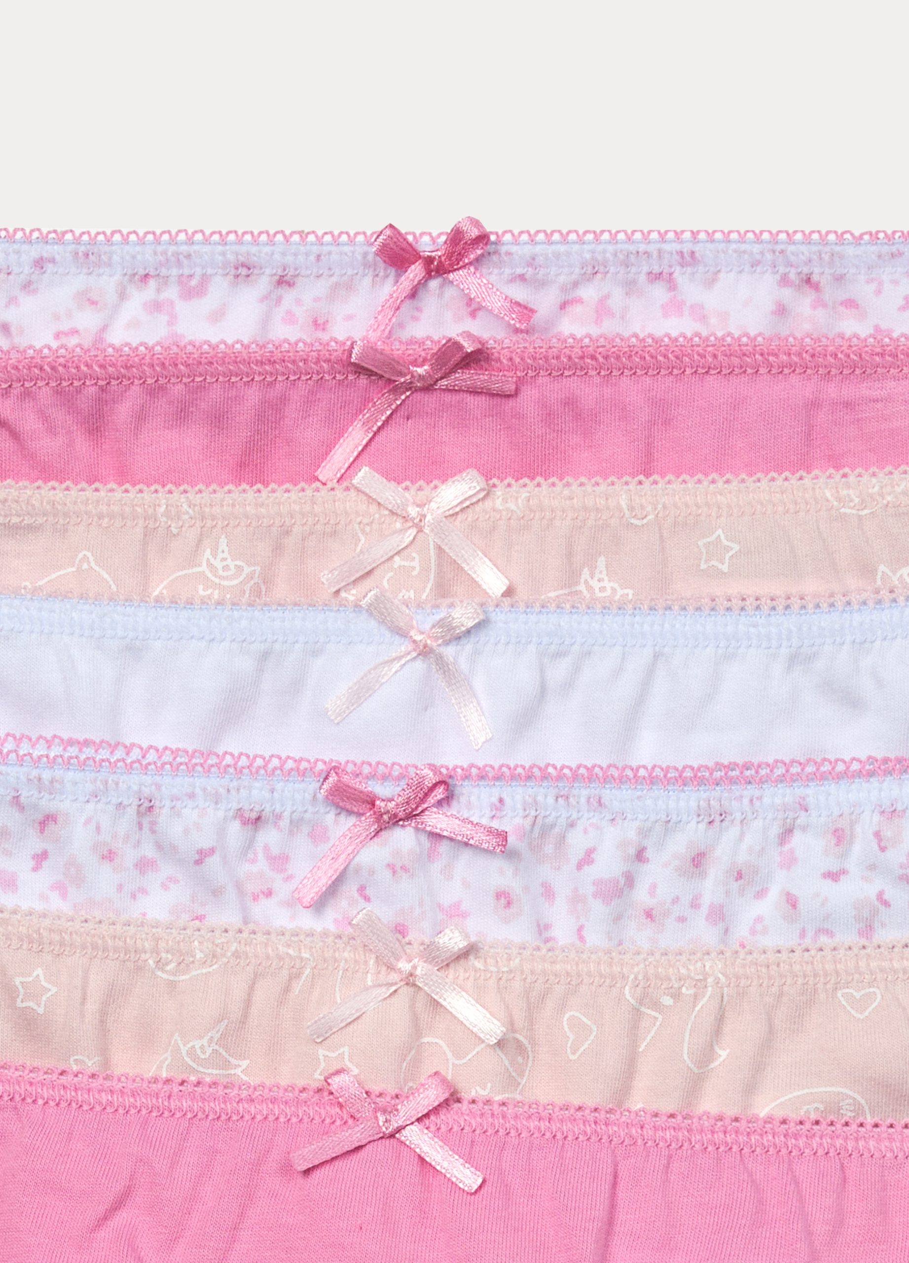 Pakiranje od 7 slip gaćica od jerseya čistog pamuka s elastičnim strukom i našivenom mašnom. Različite boje i uzorci.