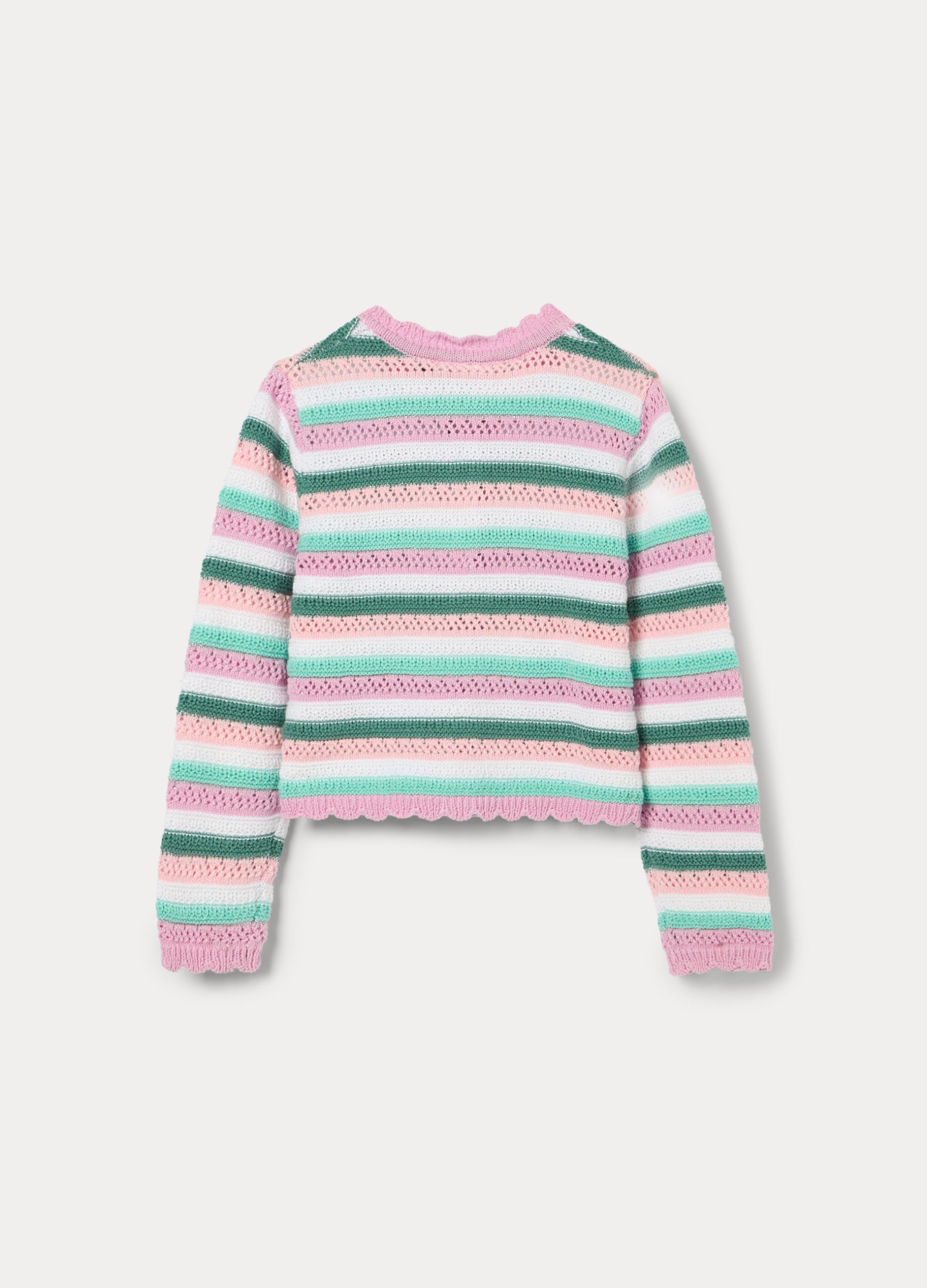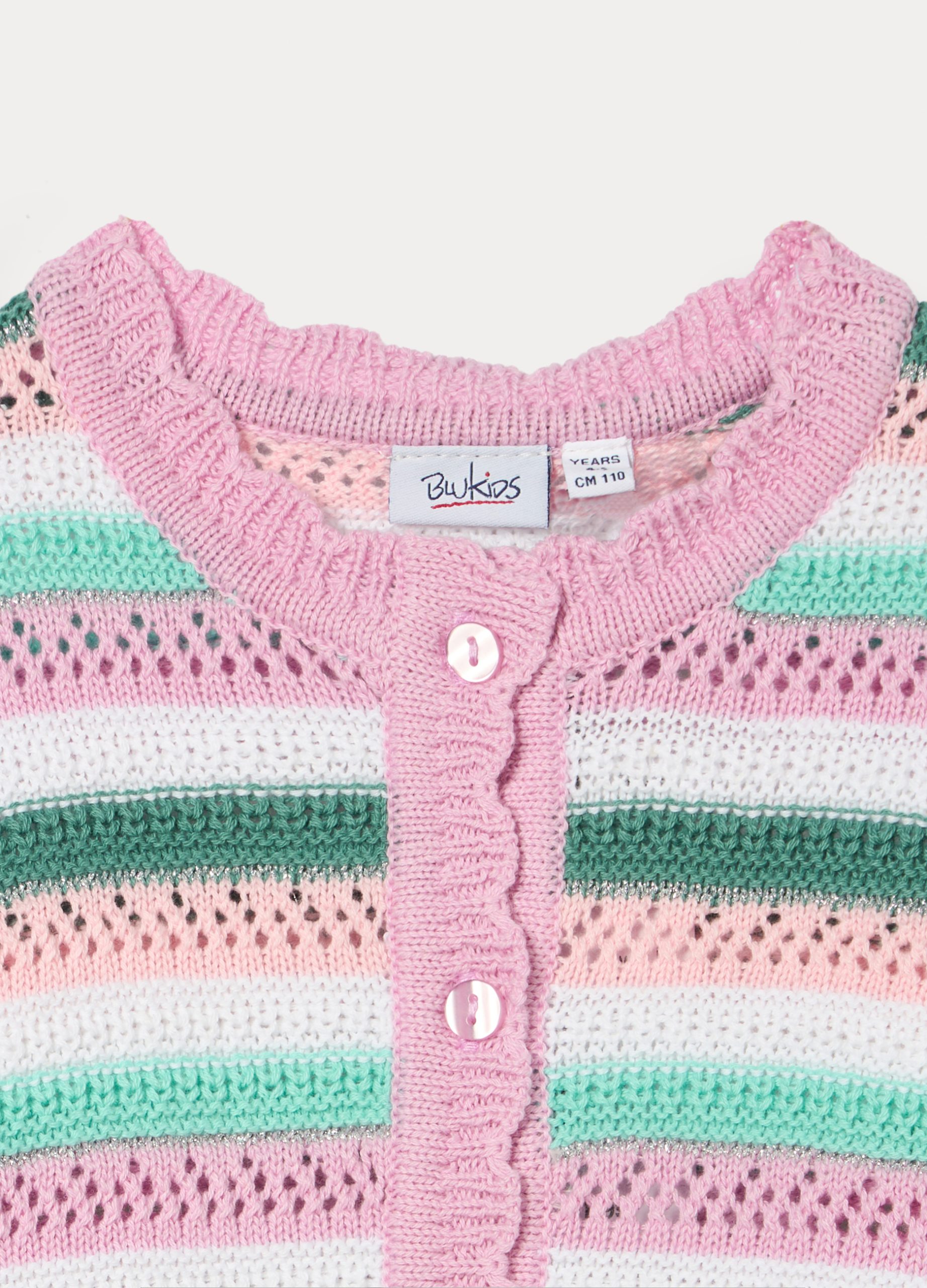 Pleteni kardigan od čistog pamuka s perforiranim detaljima i raznobojnim prugastim uzorkom. Okrugli izrez i rebrasti obrubi.