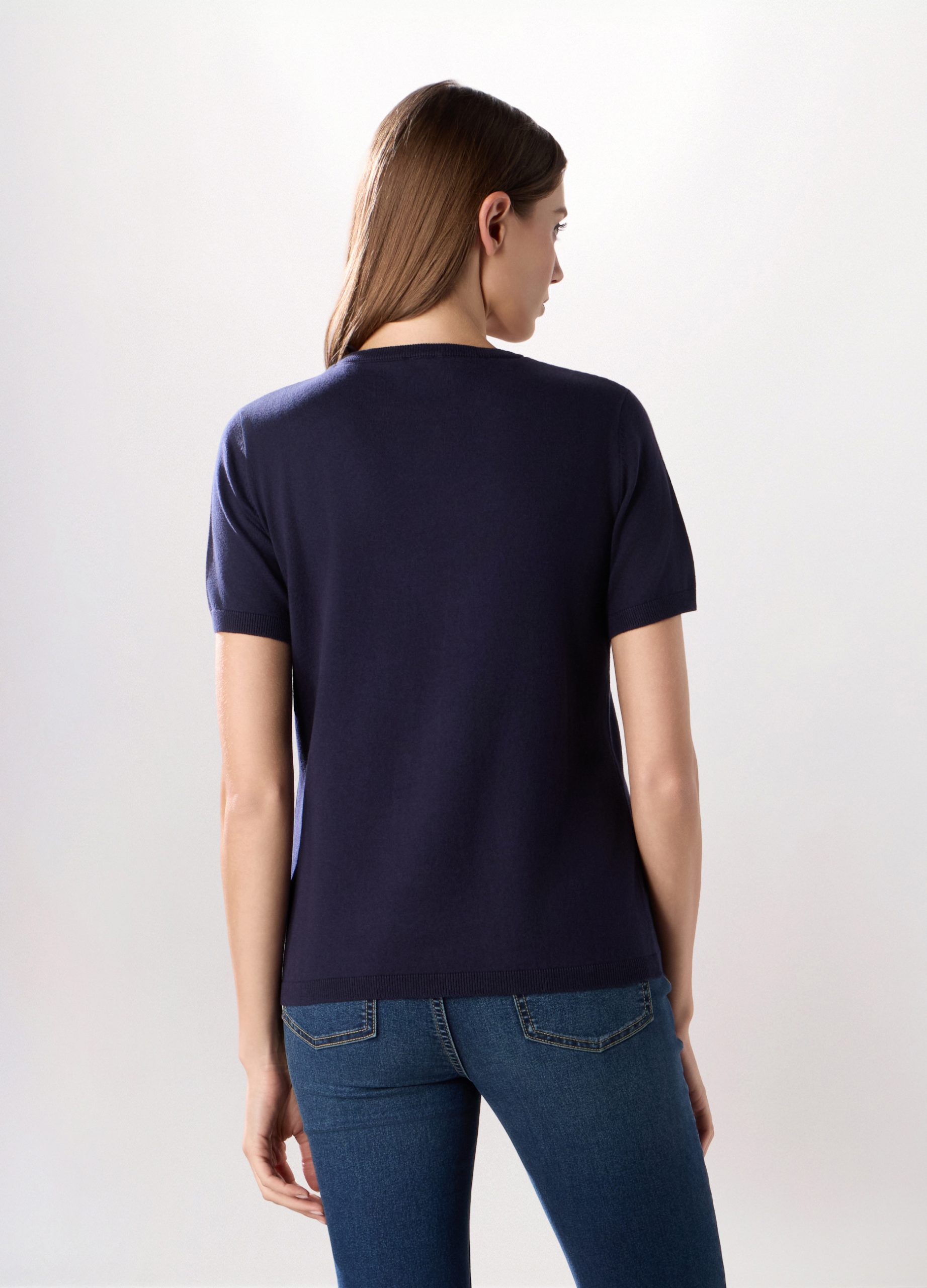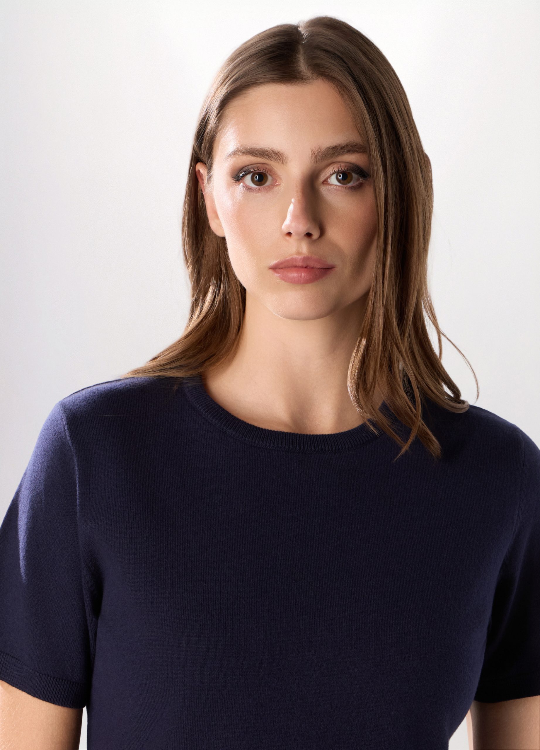 Pletivo kratkih rukava od mješavine pamuka, jednobojno, s okruglim izrezom. Rebrasti obrub na ovratniku, rubu rukava i donjem rubu.