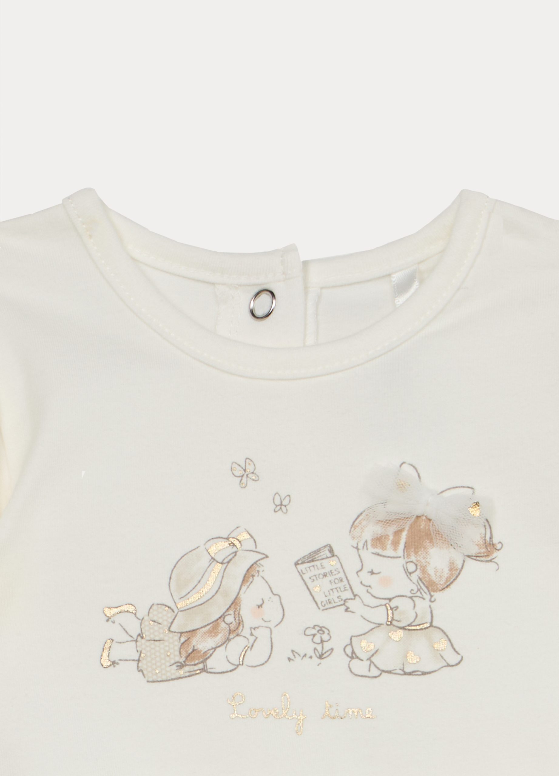 Bodi od rastezljivog pamučnog jerseya s okruglim izrezom i kratkim balonskim rukavima. Otisak na prednjoj strani i našivena suknja od tila s otiskom. Kopčanje gumbima na leđima i međunožju. Traka za glavu s našivenom mašnom od tila.