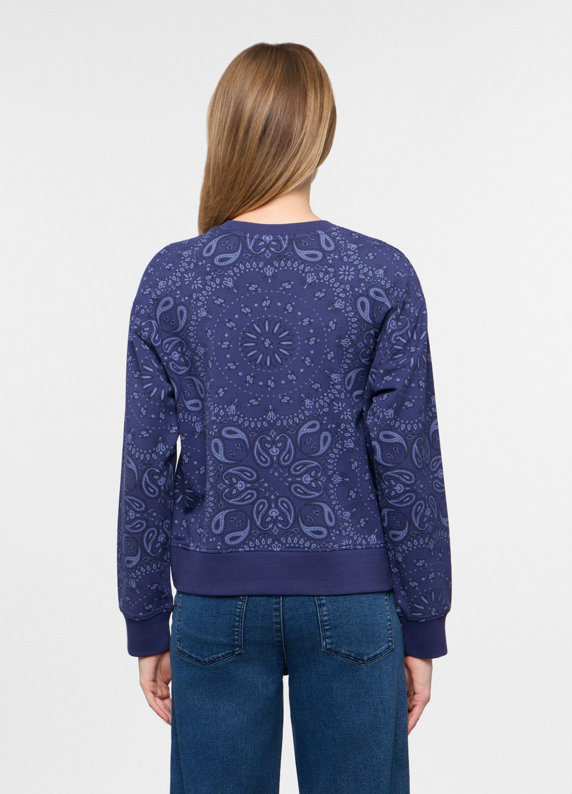 Pulover okruglog izreza od rastezljivog francuskog frotira od čistog pamuka s otiskom po cijeloj površini. Okrugli izrez, donji dio i manšete od rebraste tkanine.