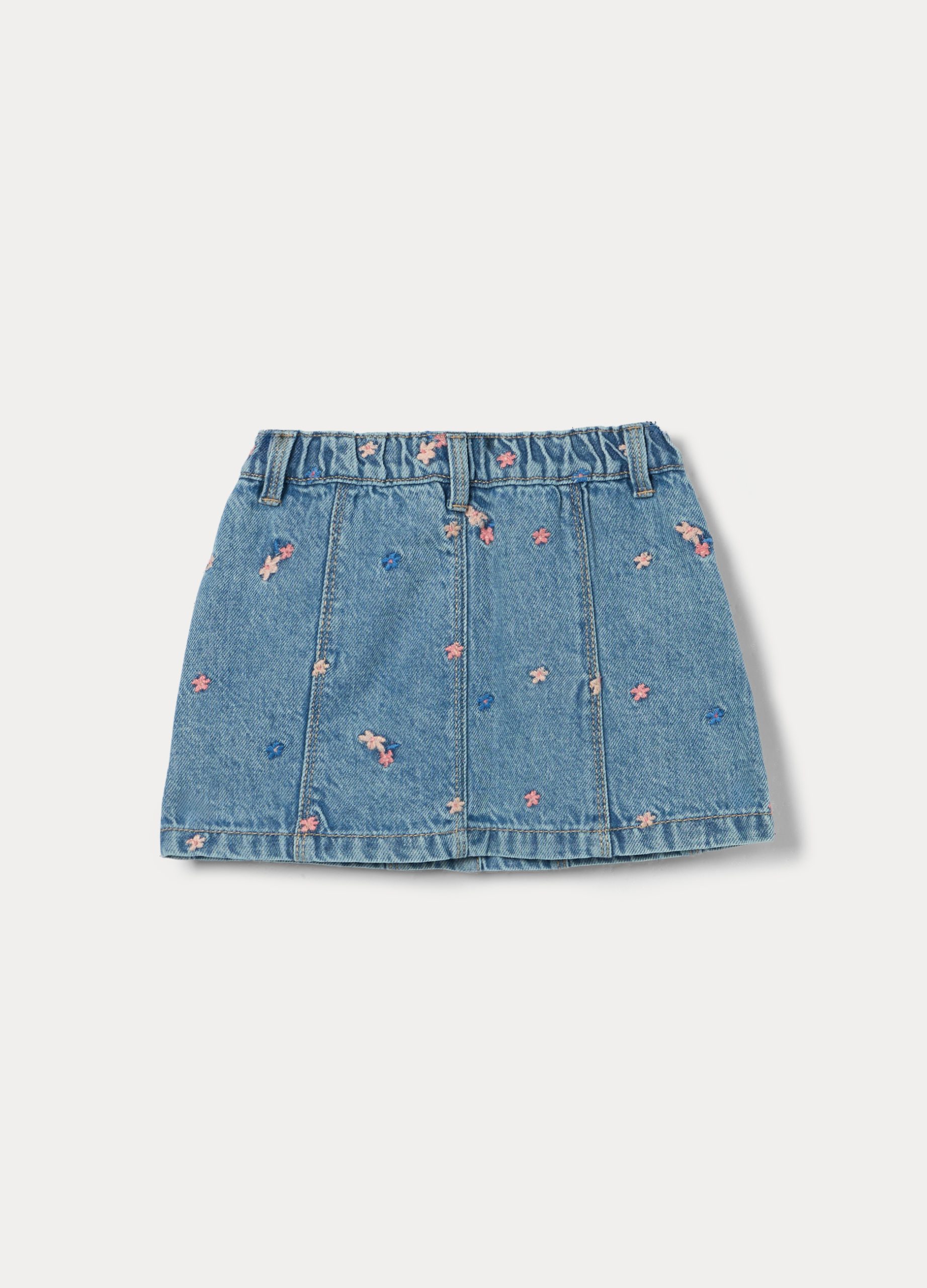 Suknja od čistog pamučnog trapera s elastičnim strukom i vezom. Dva džepa sprijeda. Kopčanje na gumb i patentni zatvarač.