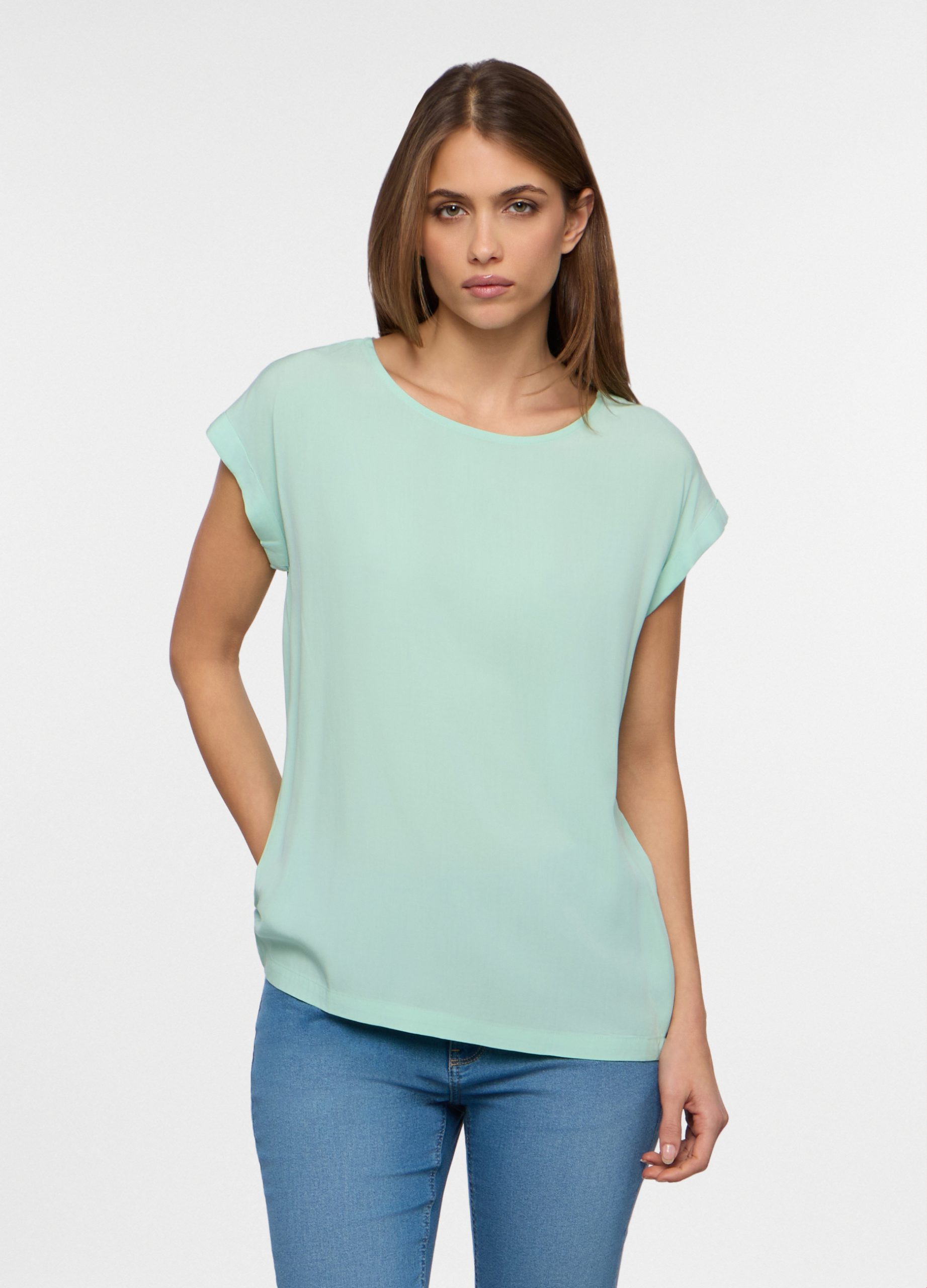 Top od čiste viskoze s okruglim izrezom i kratkim rukavima s manžetama. Jednobojni.