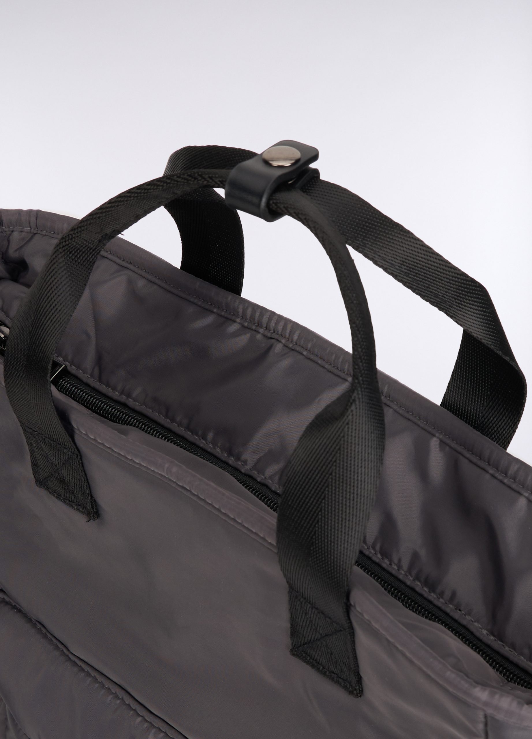 Torba-ruksak od tkanine sa zatvaranjem na patentni zatvarač. Dva našivena bočna džepa i jedan na patentni zatvarač sprijeda.