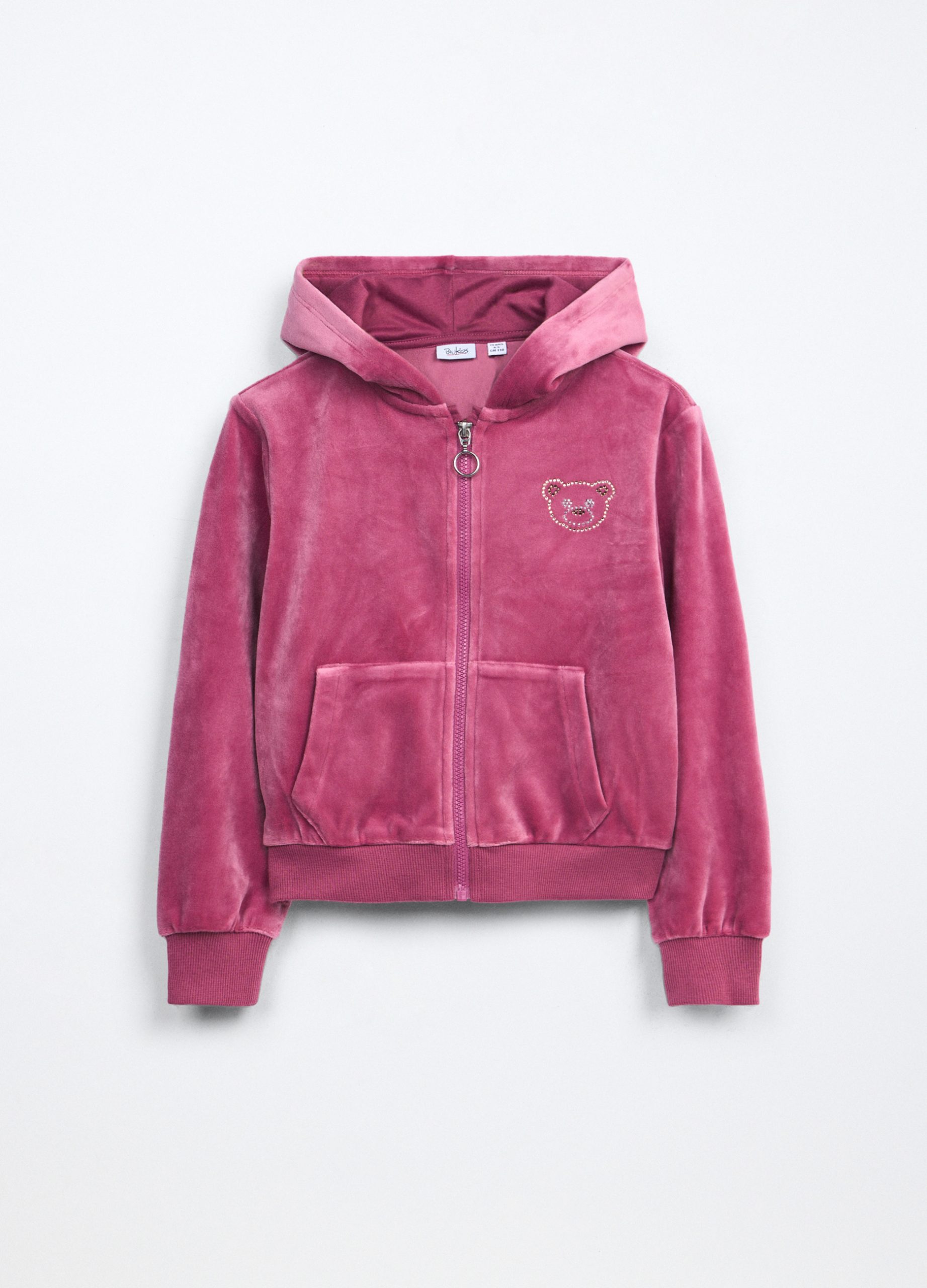 Velur majica s kapuljačom i potpunim zatvaranjem na patentni zatvarač. Dva našivena džepa sprijeda. Donji rub i manšete rebrasti.