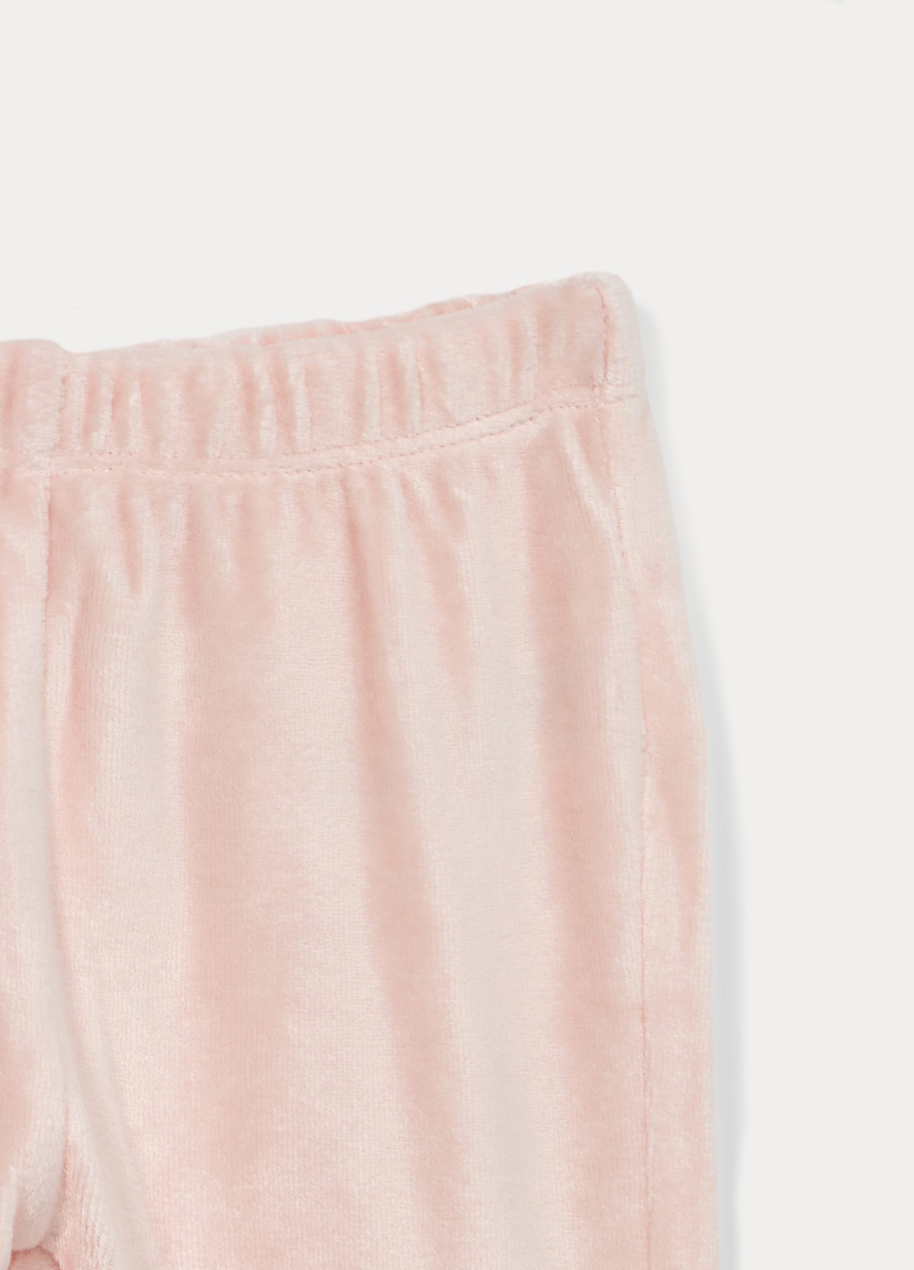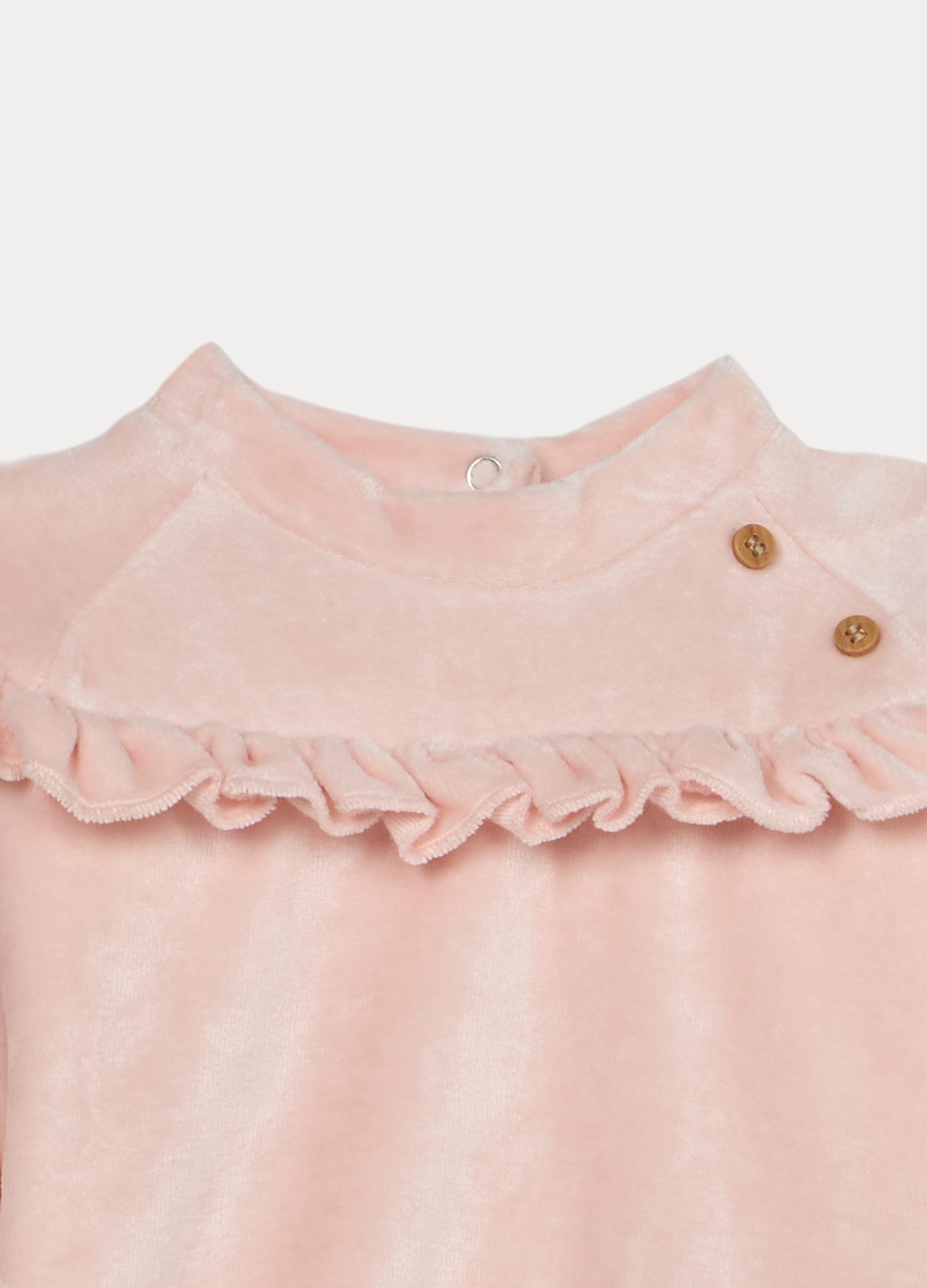 Velurna odjeća od mješavine viskoze i bambusa koja se sastoji od majice okruglog izreza s našivenim volanima. Kopčanje na gumbe straga. Hlače s elastičnim strukom. Jednobojna.