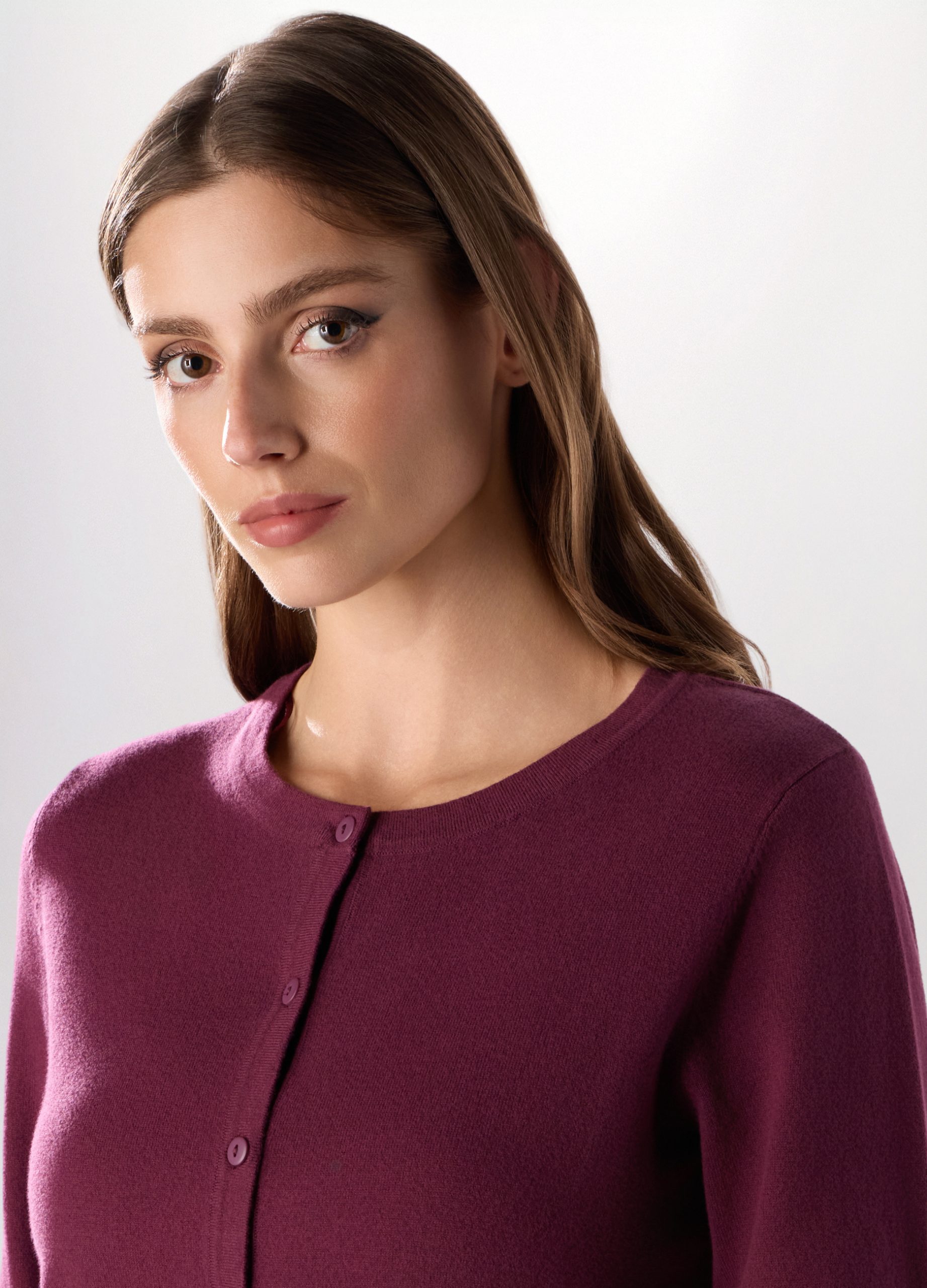 Kardigan od mješavine pamuka okruglog izreza s kopčanjem na gumbe. Jednobojan.